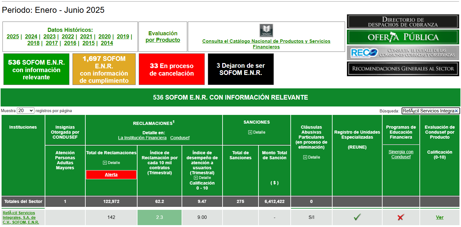 La presente información corresponde únicamente a “Refácil Servicios Integrales”, S.A. de C.V. SOFOM, E.N.R., para conocer mas información de todo el sector.